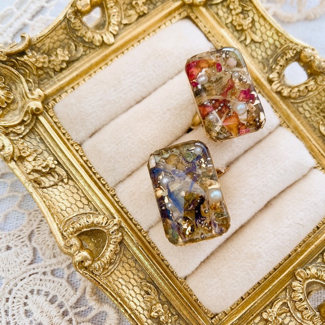 ガラスポットの中の色鮮やかなハーブティー そんなイメージで制作したパーツです ボタニカルを取り入れたアクセサリーは色々あるけれど お花だと可愛すぎちゃうな・・・という方にもしていただきたいなとの思いで生まれたシリーズです こちらは大きめのパーツですがシックでアンティーク感もあり馴染みやすいかと思います 【サイズ】 リング・・・フリー(約7号〜18号)※お届け時のサイズは約11号です モチーフ・・・約1.8cm X2.6cm / 厚み約8mm 【素材】 ハーブ・パールビーズ・メタルパーツ・樹脂 【金具】 リング金具・・・合金 (申し訳ございませんがアレルギー対応ではございませんのでご注意くださいませ) ✳︎画像は撮影状況の関係やご使用のブラウザやパソコンによって実際の色味と若干異なる場合がございますので予めご了承下さい