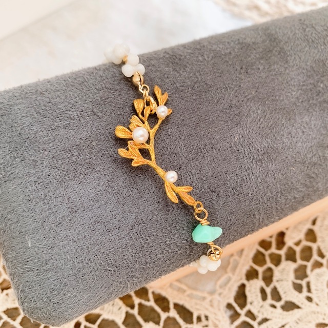 サンゴビーズと真鍮パーツを合わせたブレスレット ちょっと変わった変形ビーズがツブツブと可愛いデザイン ボタニカルパーツにもパールビーズをあしらいました 留め具には近付けるとパチンと止まるマグネットクラスプ採用で面倒な着脱も楽チン仕様 落下防止にチェーンをつけていますのでうっかり外れてしまっても安心です 【サイズ】 ブレスレット内径・・・約17.5cm〜18cm 落下防止チェーン・・・約5cm 【素材】 真鍮パーツ・サンゴ・クリソプレーズ・真鍮ビーズ・スワロフスキークリスタルパール 【金具】 金具・・・合金 (申し訳ございませんがアレルギー対応ではございませんのでご注意くださいませ) ✳︎画像は撮影状況の関係やご使用のブラウザやパソコンによって実際の色味と若干異なる場合がございますので予めご了承下さい