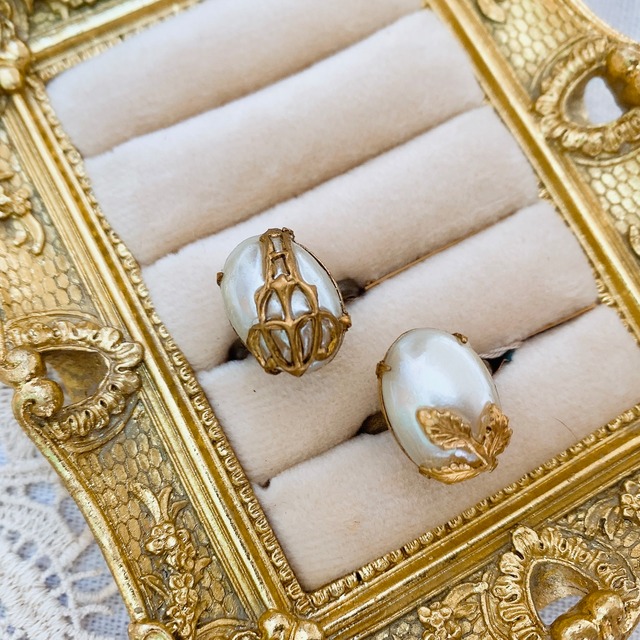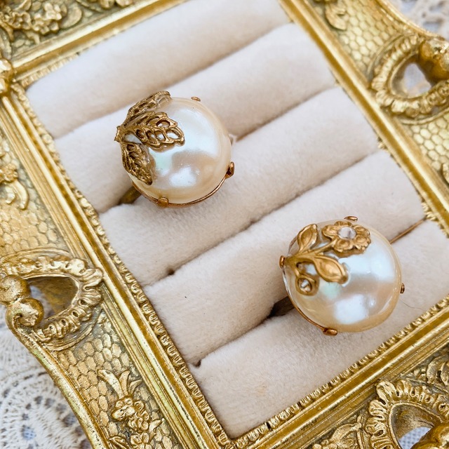 パールカボションに真鍮パーツでおめかししたリング 天然のパールではなかなか味わえないこのサイズ感 コロンとした形とプラスティック芯ならではの軽やかさで遊び心溢れる一点です 【サイズ】 リング・・・フリー(約7号〜18号)※お届け時のサイズは約11号です モチーフ・・・約1.3cm X1.8cm / 厚み約1.2cm 【素材】 ヴィンテージパールカボション(プラスティック芯)・真鍮パーツ 【金具】 リング金具・・・合金 (申し訳ございませんがアレルギー対応ではございませんのでご注意くださいませ) ✳︎画像は撮影状況の関係やご使用のブラウザやパソコンによって実際の色味と若干異なる場合がございますので予めご了承下さい
