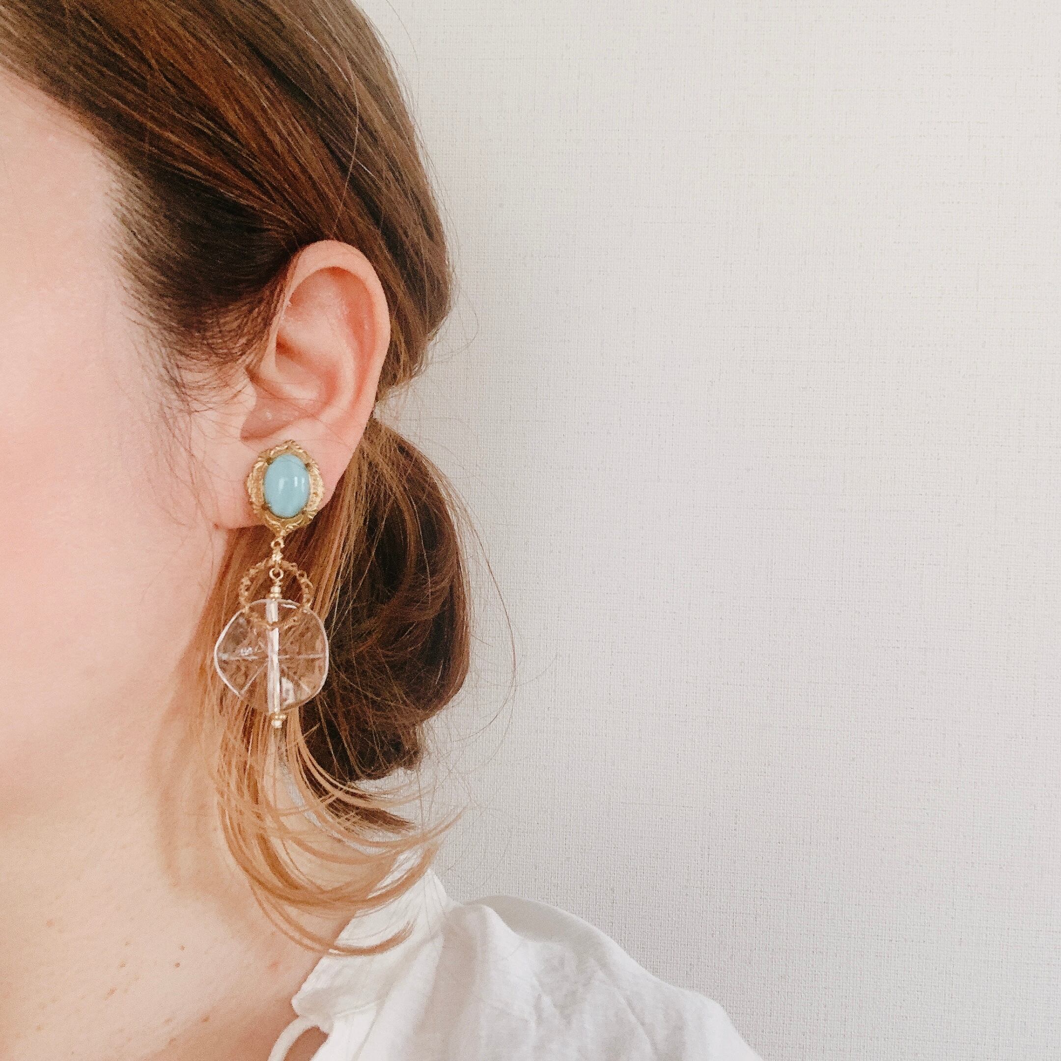 ターコイズブルーとクリアパーツの耳飾り