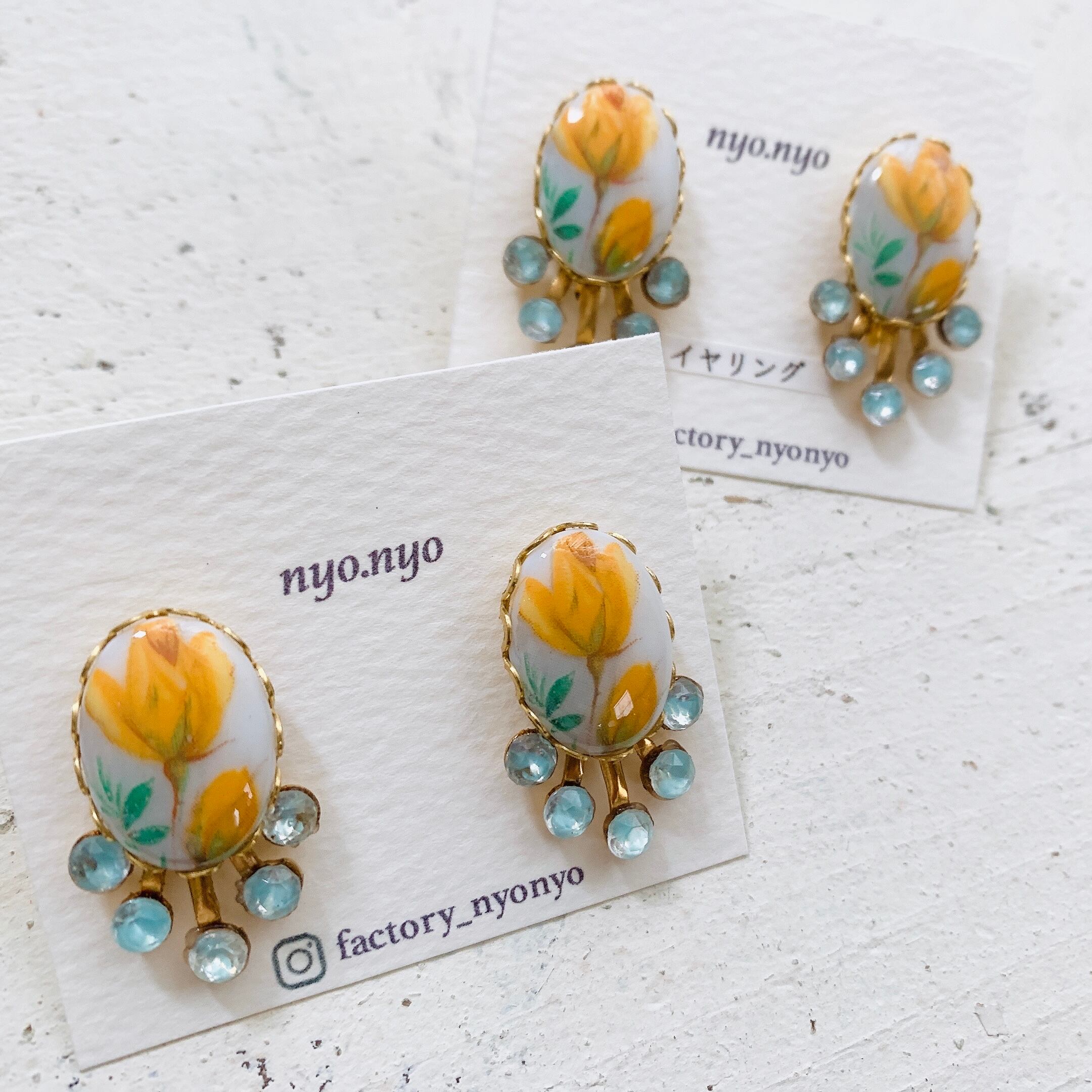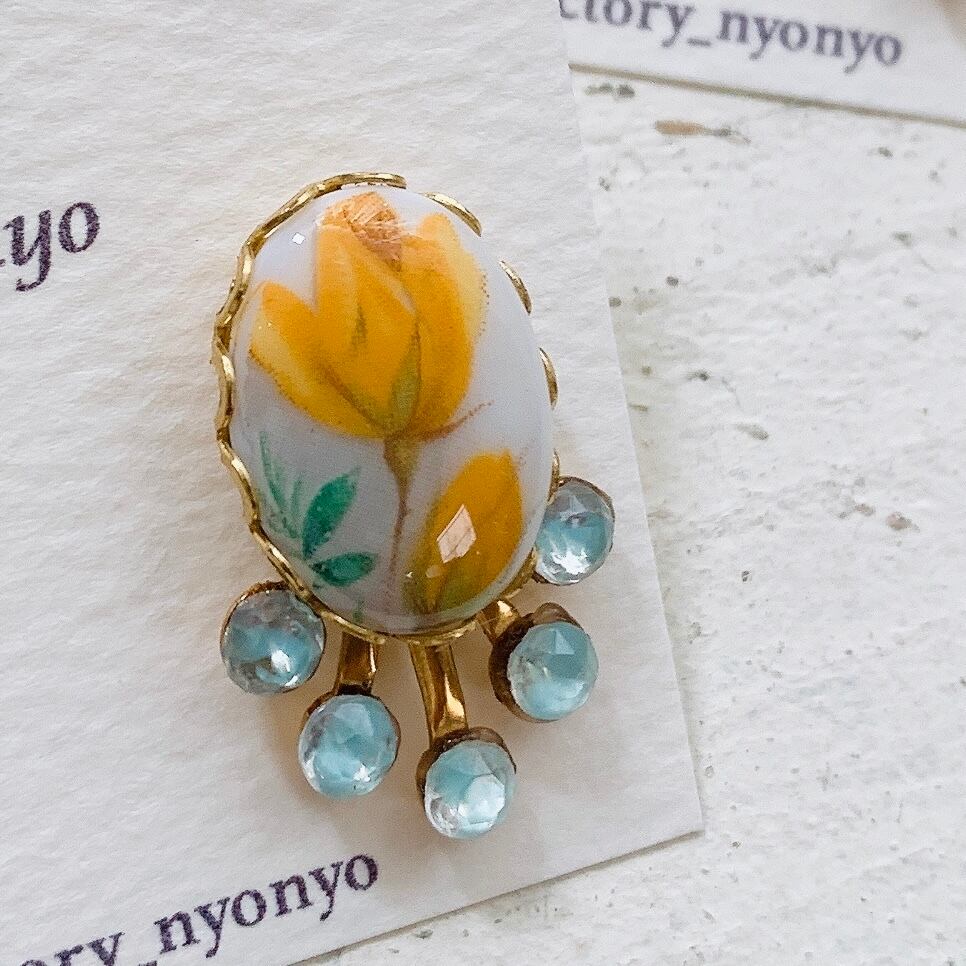 大人っぽくも可愛らしい黄色い薔薇が描かれたヴィンテージカボション