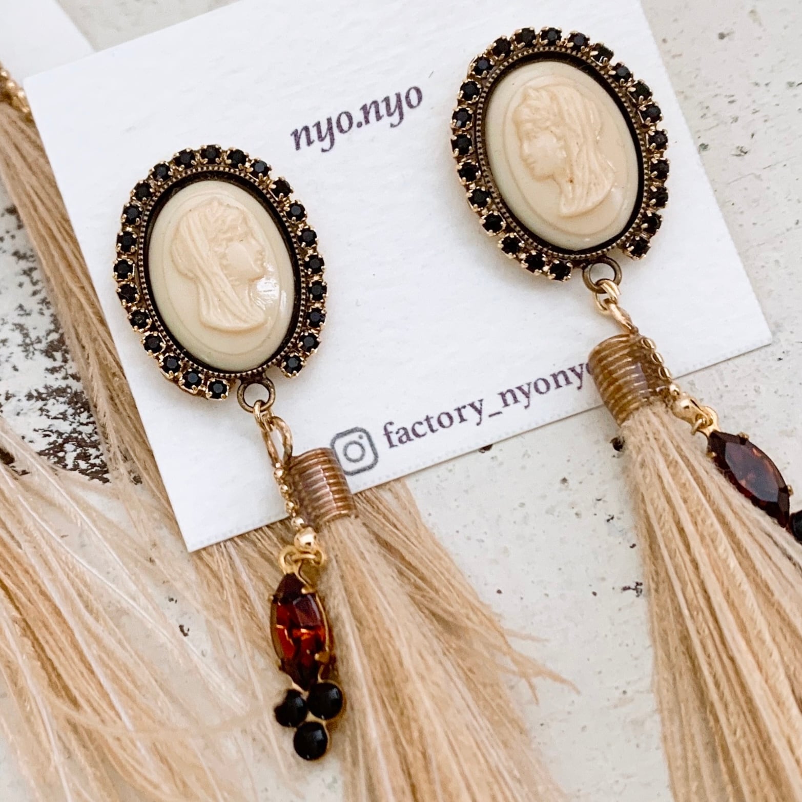 左右で女性が向かい合う優しいアイボリーのカボションにフェザーパーツを合わせた耳飾り