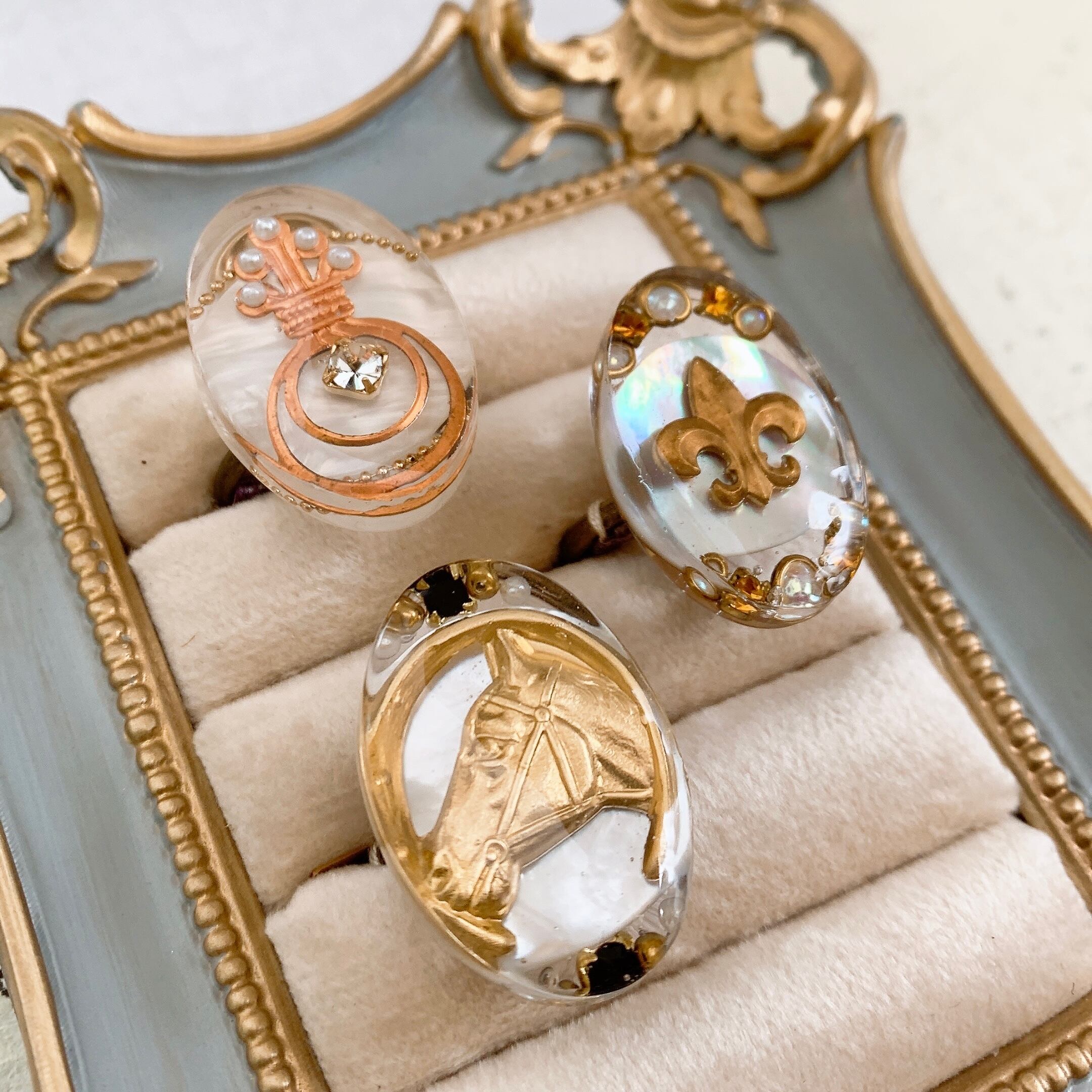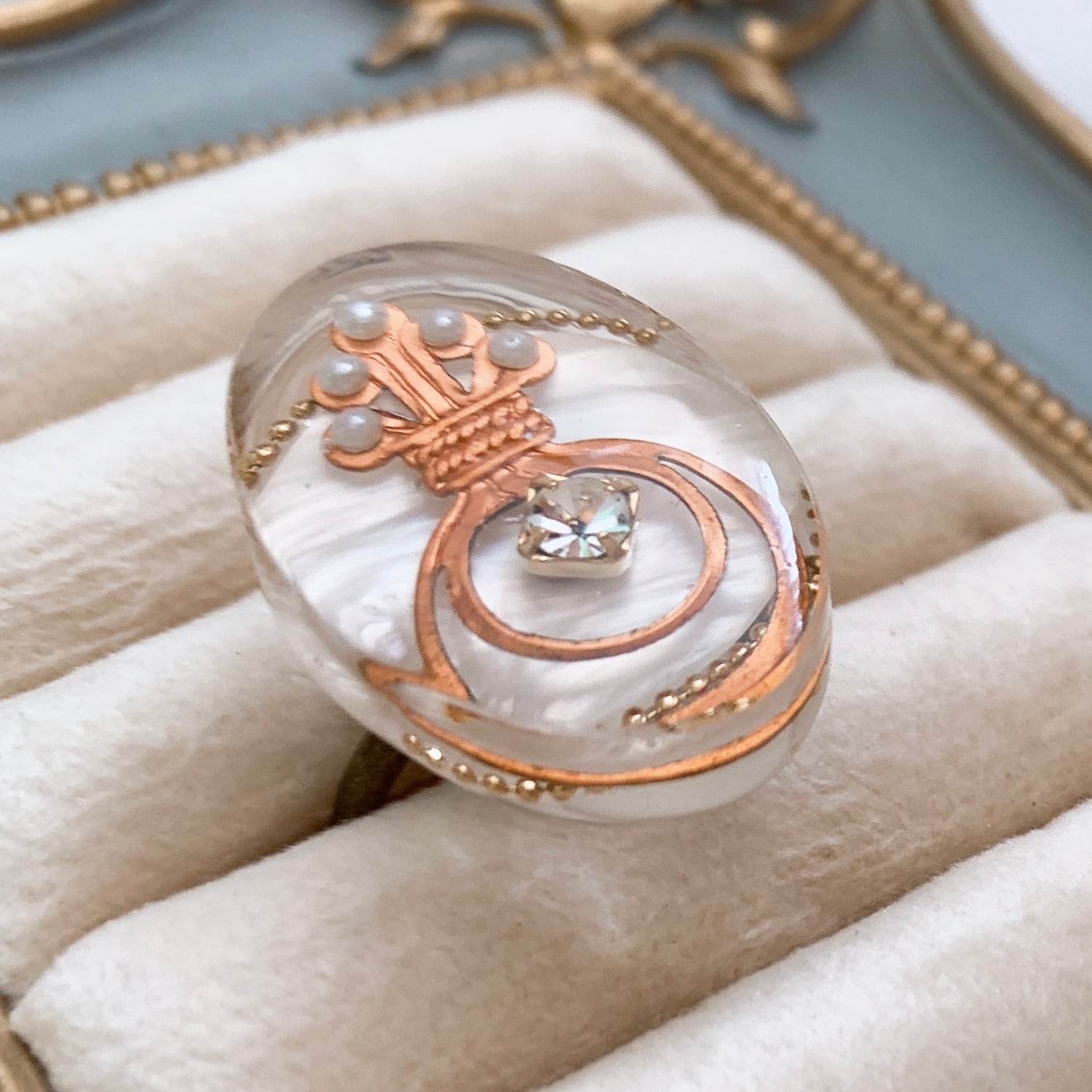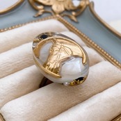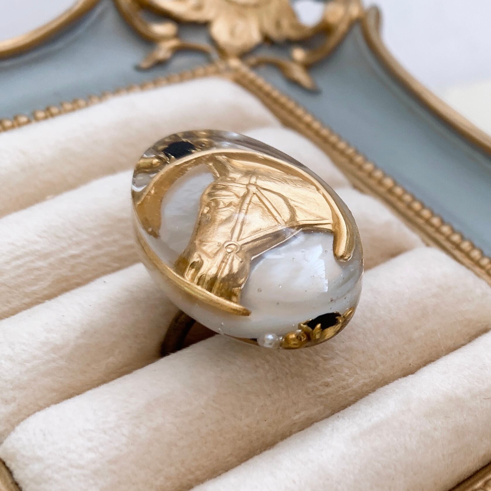 シェルをバックに真鍮パーツをコラージュしたリング